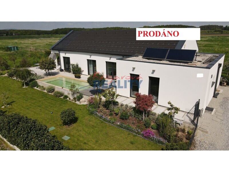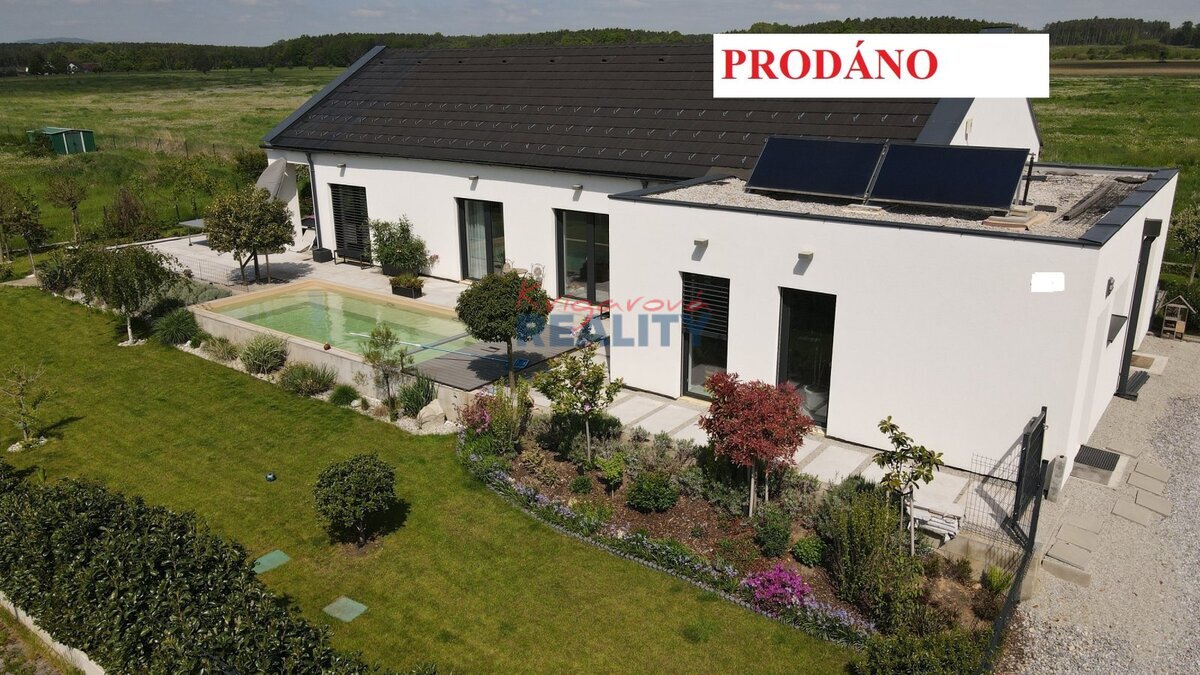 Ráda zprostředkuji prodej rodinného domu 5+kk typ bungalov na okraji obce Nové Homole. Sloužit může i jako dvougenerační, neboť je zde samostatná jednotka 27m2 se sprchou a toaletou, a samostatným vchodem. Bungalov byl stavěn od r. 2018 postupně. Pro rodinné bydlení dům splňuje veškeré požadavky, ať už je to nízká spotřeba energií, pokoje mají okna na jižní stranu, dům je bezbariérový, má retenční nádrž na dešťovou vodu a rekuperační jednotku vzduchu. Úložné prostory jsou šikovně vyřešeny vestavěnými skříněmi. Dále jsou zde dvě technické místnosti, na kotel a zásobník vody, a dále malá dílna. Všechny místnosti mají vstup ven na pozemek, a venkovní rolety. U kuchyně je samostatná spíž s oknem, v ložnici samostatná šatna. Centrální místností domu je krásně prosvětlená kuchyně se středovým pracovním pultem, jídelna s okny do zahrady, a obývák se vstupem na krytou terasu. Tento prostor je prosvětlený ze tří stran a má 45m2. Topení v bungalovu je vyřešeno plynovým kotlem do podlahy, v kombinaci se solárními panely na střeše domu, v obou koupelnách je navíc žebříkové topení na ručníky. Podlahy dlažby, vinylová plovoucí s korkem. V garsonce je navíc infrasauna, zatím je jednotka bez kuchyňské linky, ale je zde vyvedena voda a odpady, a linka se dá lehce namontovat. Pak může tato jednotka ( 27m2) sloužit k bydlení, nebo provozování podnikatelské činnosti. Půdní prostor nad celým domem, je možné využít k uložení sezóních věcí. Celý dům (142m2) má dlážděnou terasu okolo domu a bazénu, na jižní stranu zastřešenou terasou (7,6m2), a snadno udržovatelnou vzrostlou zahradu se samozavlažovacím systémem. Plocha pozemku činí 887m2. Parkování u domu pro nejméně dvě auta. Jednou z výhod je místo, protože dům stojí v klidné uličce mezi obytnými domy v poslední řadě, s výhledem na les, a louky, avšak v dosahu MHD. V obci obchod, cukrárna, hospůdka, dětské hřiště, školka, městská hromadná doprava. Kupní cena 12.990.000,–Kč.